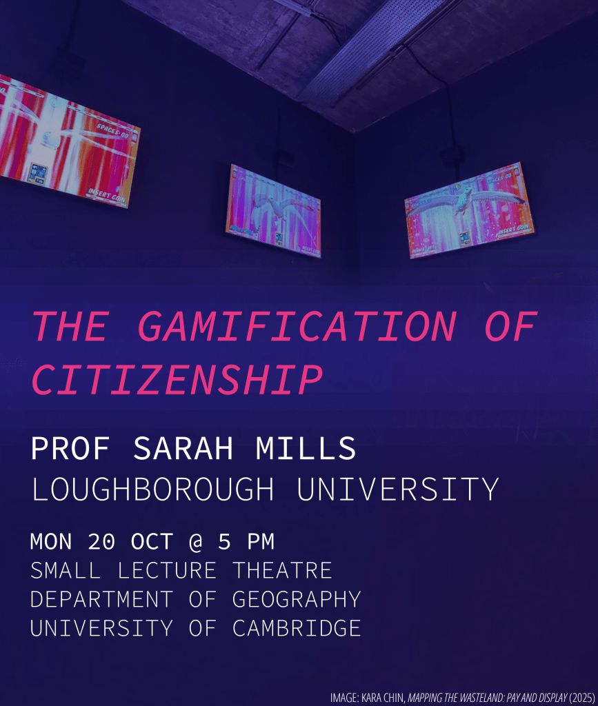- I’m also presenting in the Department of Geography and Environment, Loughborough University Seminar Series this term, on “The Gamification of Citizenship”, 15th October, 1pm (EHB205).